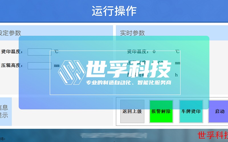 运行操作界面:运行操作界面分为设定参数模块、实时参数模块、信息提示模块、按钮操作模块。设定参数模块中可以设置烫印机的烫印温度、压辊高度,点击输入框能够自动弹出输入小键盘实现数字输入。实时参数模块能够实时显示当前烫印机的烫印温度、压辊高度、胶辊用时三项参数。信息提示界面分为三行,每一行分别显示一类状态,共能够显示超过15种设备运行状态及报警信息。按钮操作模块可以启动/停止设备,操作车牌烫印/暂停,当报警排除后可以解除报警,结束运行后可以返回上级。